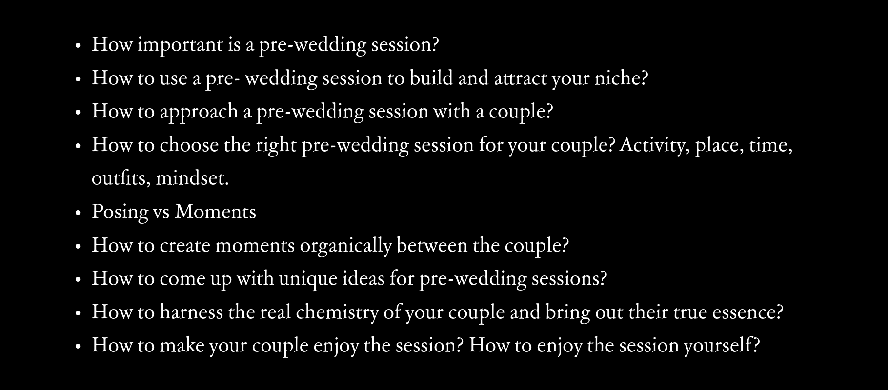 An 8 hour in-depth online masterclass with Sushanth about pre-wedding sessions